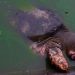 Over the course of the last century, the number of large turtles in the Hanoi Lake have dwindled with only a single animal remaining since 1968, the lake has not provided an adequate habitat for a population of the species to breed and survive. Although a famous individual, the Hoan Kiem Turtle, was also an animal of huge conservation importance. He was one of only four Swinhoe’s Softshell Turtles (Rafetus swinhoei) known in existence. One animal was confirmed in the wild at Dong Mo Lake, Hanoi, in 2007 by the Asian Turtle Program of Indo-Myanmar Conservation for which an ongoing conservation project continues to try to safeguard the turtle. Two more, a male and a female, have been kept together at the Suzhou Zoo, China, since 2008 and nested annually but no eggs have hatched. Unfortunately an injury sustained during a fight many years ago is believed to have left the male unable to copulate successfully. To date, multiple attempts at artifical insemination have failed.