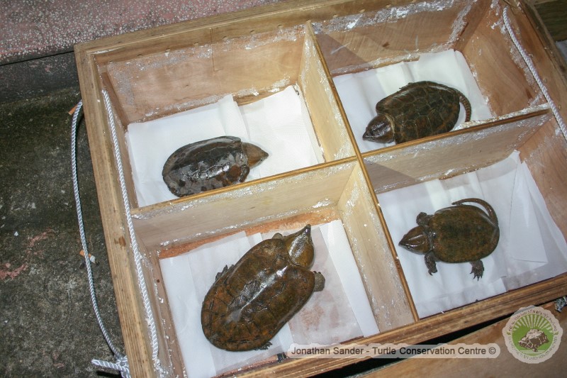Staff at the Turtle Conservation Centre (TCC) in Cuc Phuong National Park worked over night for 14 hours last night to deal with the most recent rescue. Following a confiscation of 69 turtles including 68 Big-headed Turtles (Platysternon megacephalum) and one Impressed Tortoise (Manouria impressa) from Ninh Binh province. All the animals had been wrapped in socks or net bags, some have serious injuries to their tails and limbs and they had been covered in unknown powder. The powder was possibly forced into the animal’s stomachs to increase their body weight to increase the sale price.